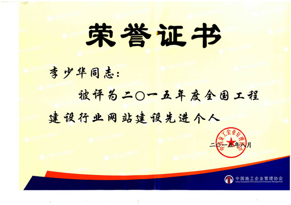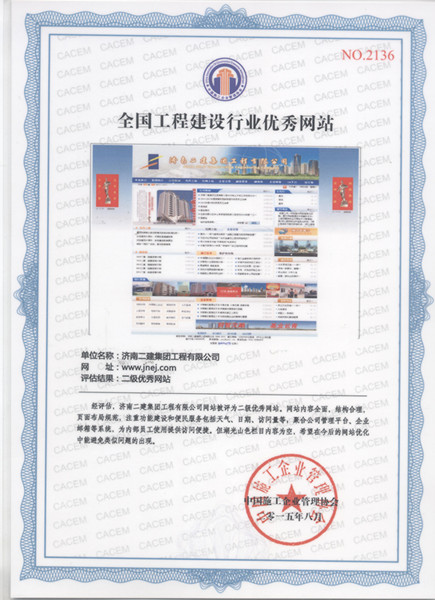 濟(jì)南二建集團(tuán)工程有限公司網(wǎng)站被評為2015年度全國工程建設(shè)行業(yè)二級優(yōu)秀網(wǎng)站,李少華同志被評為2015年度全國工程建設(shè)行業(yè)網(wǎng)站建設(shè)先進(jìn)個人。