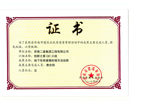 創新之星QC小組“地下車庫滲漏封堵方法創新”成果主要完成人員——費忠陽