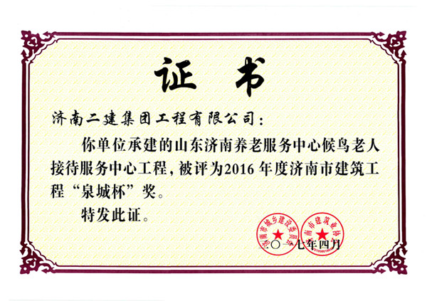 集團公司承建的濟南養老服務中心候鳥老人接待服務中心榮獲2016年度濟南市建筑工程“泉城杯”獎