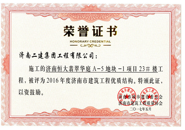 集團施工的恒大翡翠華庭A-5地塊-1項目23#被評為2016年度濟南市建筑工程優質結構