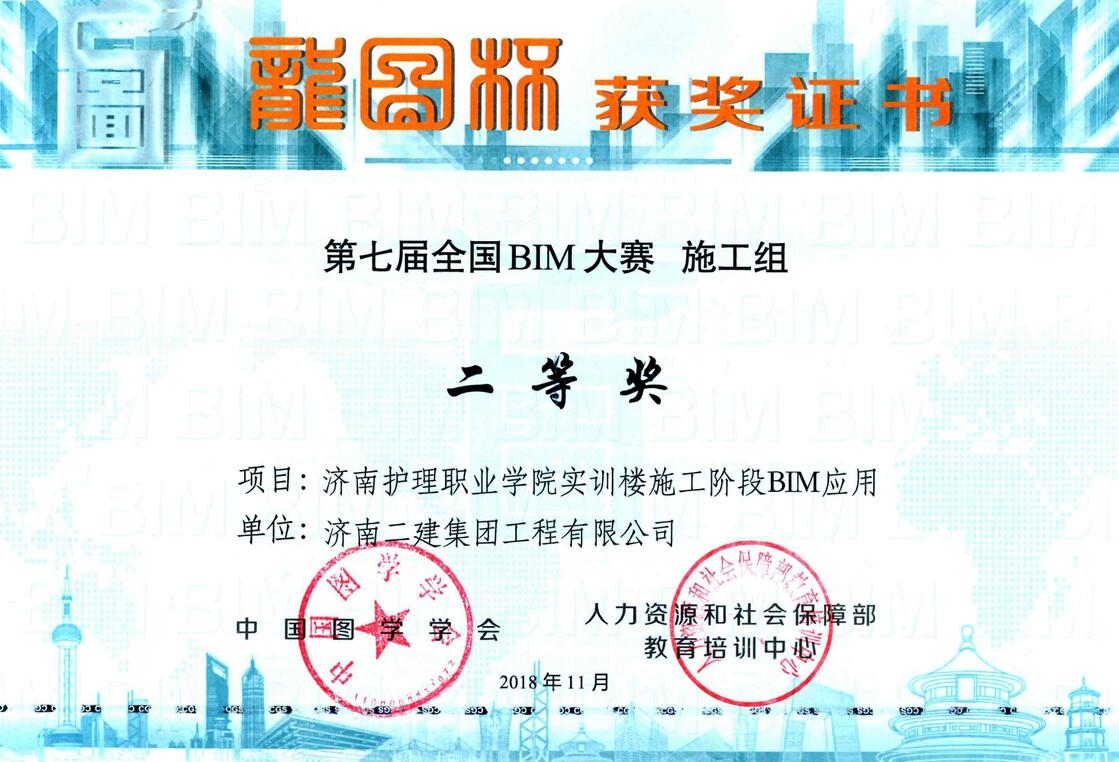第七屆“龍圖杯”全國(guó)BIM大賽頒獎(jiǎng)與BIM高峰論壇,于2018年11月29日在國(guó)家會(huì)議中心舉行。我公司申報(bào)的《濟(jì)南護(hù)理職業(yè)學(xué)院實(shí)訓(xùn)樓施工階段BIM應(yīng)用》成果喜獲施工組二等獎(jiǎng)。